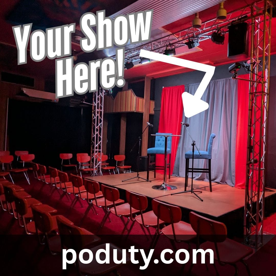 Poduty Live Podcast Theater is a dedicated live-event venue in Tarentum, Pennsylvania, built for podcasters to perform, record, and stream shows in front of an audience. It features a main stage, professional audio/video production, and space for hybrid live/virtual experiences. Poduty supports local creators with workshops and festivals that help podcasters grow their shows, connect with fans, and build community through high-quality live podcast events.